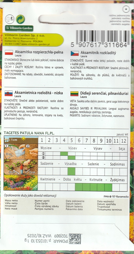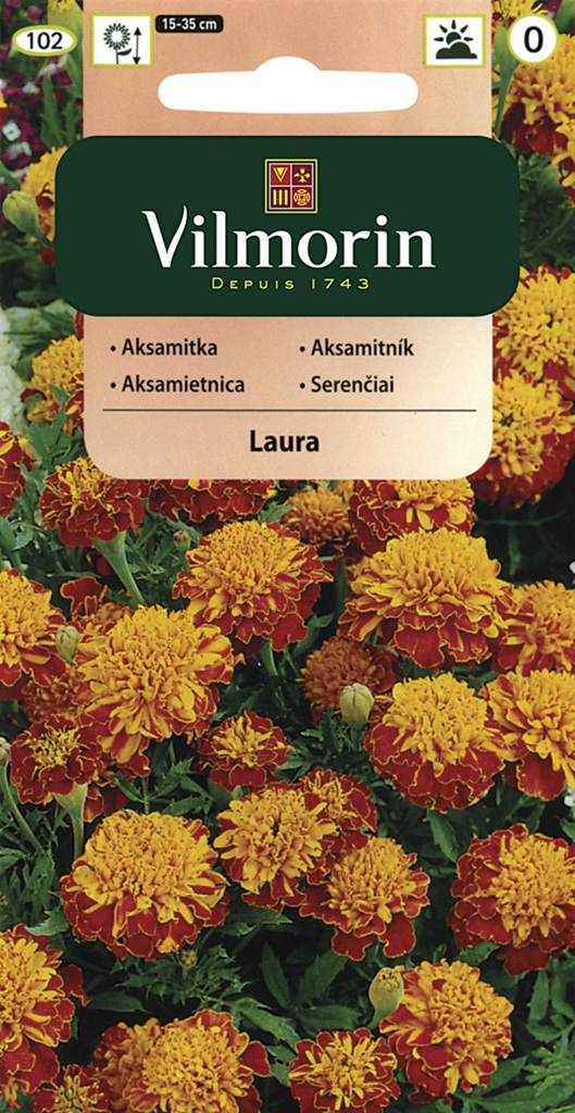 Laura je červeno-oranžová odrůda aksamitníku rozkladitého (Tagetes patula nana). Snadné pěstování, nenáročná květina.
