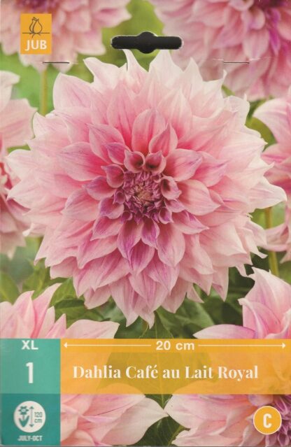 Hlízy jiřiny balené v kartách s barevným obrázkem. Cafe au Lait Royal (jedna ze sester oblíbené Cafe au Lait) je velkokvětá odrůda jiřiny, která má malinově růžové květy o průměru až 20 cm a dorůstá do výšky až 120 cm.