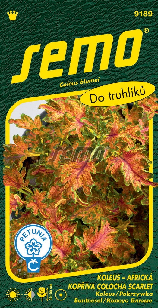 Colocha Scarlet je odrůda africké kopřivy (Coleus blumei), nenáročná keřovitá trvalka, citlivá na mráz, takže ji v našich klimatických podmínkách pěstujeme jako letničku (v záhonových výsadbách) či pokojovou květinu (v nádobách). Skvěle se hodí i do velkých nádob na terasách. Koleus (africká kopřiva) Colocha Scarlet je odrůda středního vzrůstu (cca 45 až 50 cm), bohatě rozvětvená, středně kompaktní. Na první pohled upoutá neobvyklým až exotickým tvarem i atraktivním zbarvením listů, které jsou oranžové až tmavě červené (šarlatové) se zeleným okrajem (či skvrnami). Barva listů je velmi sytá, s pestrými odstíny, na slunci nebledne. Africká kopřiva pochází z tropických oblastí Afriky, Asie a Austrálie, dobře ale snáší nízké (i vysoké) teploty a svou dekorativnost si zachovává až do prvních mrazů. Rostlina je ozdobná listy, doporučujeme proto zaštipovat a odstraňovat tvořící se drobná a nevýrazná soukvětí, čímž udržíme větvený a kompaktní tvar rostliny (ceněnou vlastností je rovněž pozdní nakvétání). V suchém období je třeba zajistit dostatečnou závlahu, protože přesušení urychluje začátek nežádoucího kvetení.
