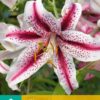 Cibuloviny lilie balené v kartách s barevným obrázkem. Dizzy je odrůda orientální lilie, která má překrásné a velké sněhově bílé květy s růžovými až fialovými pruhy (a tmavě fialovými tečkami) a dorůstá do výšky až 100 cm.