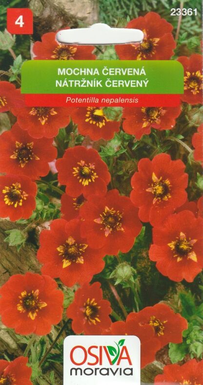 Červená varianta mochny nepálské (Potentilla nepalensis), velmi nenáročná a vděčná trvalka s listy podobnými jahodníku a třešňově červenými květy.