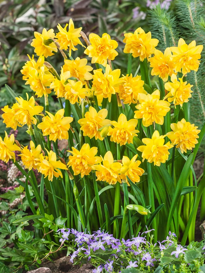 Cibuloviny narcisu balené v kartách s barevným obrázkem. Tête Bouclé patří mezi plnokvěté zakrslé narcisy, dorůstá do výšky cca 20 cm. Květy jsou menší, bohatě vrstvené (až nadýchané), zlatavě žluté barvy (s jemnými odstíny). Neobvyklé květy s množstvím okvětních lístků trochu připomínají květy měsíčku. Listy jsou úzké, trávovité a vyrůstají v trsech. Kvete velmi brzy na jaře, vhodný i pro pěstování v nádobách.