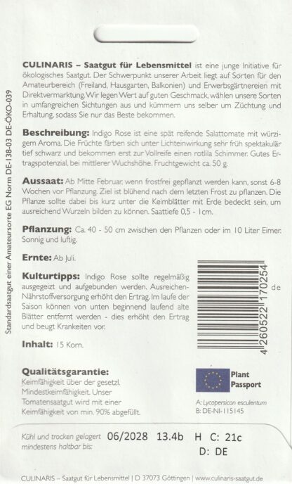 Indigo Rose je polopozdní odrůda tyčkového (indeterminantního) rajčete (Solanum lycopersicum), určená pro skleník i pole. Skutečná novinka poslední doby. Slupka mladých plodů těchto rajčat je fialovo černá (díky vysokému obsahu anthokyanů), nejintenzivněji na osluněné části plodu. Při zrání se spodní část (aneb „zelené líčko“ na zastíněné straně plodu) vybarvuje do červena, vrchní část plodu zůstává černá. Dužina šťavnatá, růžově červená se znamenitou chutí. Kulaté plody dorůstají hmotnosti 50 – 90 g, velikostně a způsobem použití se řadí mezi salátová rajčata. Indigo Rose je odrůda vyšlechtěná pro pěstování za zvláštních podmínek (pro zahrádkáře). Nabízíme i BIO verzi semen, které pochází z německého univerzitního šlechtění (projekt CULINARIS) a dodáváme originální osivo balené přímo šlechtitelem a vyprodukované v systému organického zemědělství.