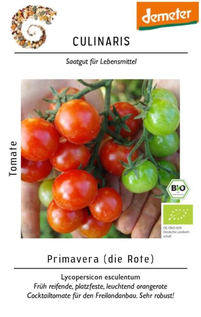 Primavera je tyčková odrůda rajčete (Lycopersicon esculentum) s jasně oranžovočervenými plody, které jsou velmi chutné (s příjemnou ovocnou sladkostí) a šťavnaté. Raná a vysoce výnosná odrůda, vytváří obrovské trsy obsypané menšími plody (o průměru cca 3 cm), kdy může mít až 50 plodů na každém trsu. Plody dorůstají hmotnosti cca 25 g (při dešti praskají trochu méně než u podobných odrůd), takže jsou ideální k přímé konzumaci, na ozdobu salátů a do zeleninových pokrmů. Rostliny jsou robustní, kompaktní, vitální a odolné (se střední hustotou olistění), pravidelně by se měly vyvazovat. Primavera je vhodná pro venkovní pěstování a je odolná proti různým chorobám. Odrůda pochází z německého univerzitního šlechtění (projekt CULINARIS) a dodáváme originální osivo balené přímo šlechtitelem a vyprodukované v systému organického zemědělství.