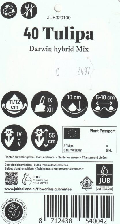 Cibuloviny tulipánu balené v kartách a XXL síťkách s barevným obrázkem. Darwin hybridy jsou charakteristické obrovskými květy s dlouhými pevnými stonky, ideální na řez do vázy. Směs obsahuje kombinaci sytých barev. Darwinovy tulipány byly vyšlechtěny na konci 19. století, kdy se podařilo zkřížit nejhezčí dostupné rostliny tulipánů a výsledkem tohoto šlechtění jsou odolné tulipány se silnými stonky a výraznými květy (pojmenovány po Charlesi Darwinovi).